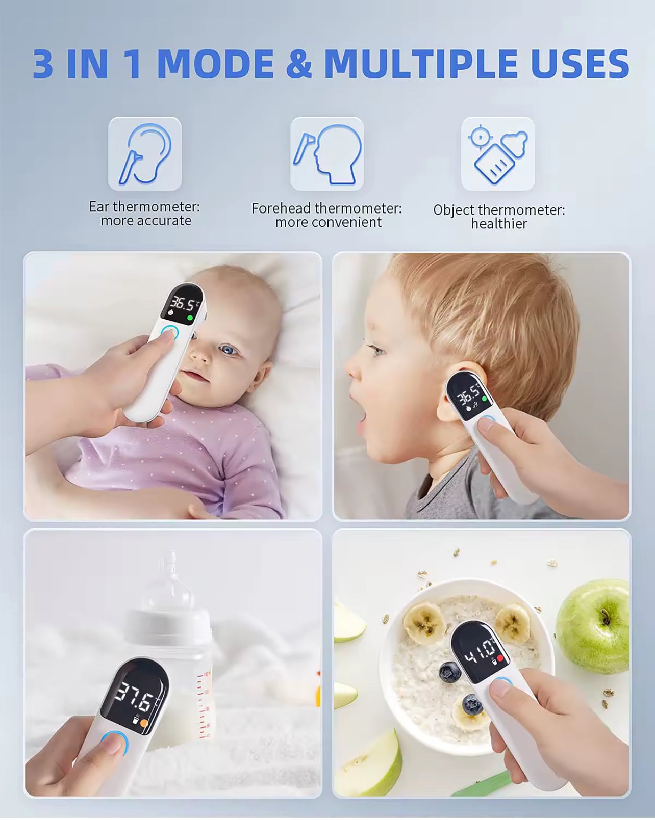 ميزان حرارة إلكتروني متعدد الوظائف يتميز بالدقة العالية وسهولة الاستخدام، مناسب لقياس حرارة الجسم عن طريق الأذن أو الجبهة، بالإضافة إلى قياس حرارة السوائل والطعام. تصميم مريح وسريع الاستجابة يوفر قراءة فورية خلال ثانية واحدة فقط.