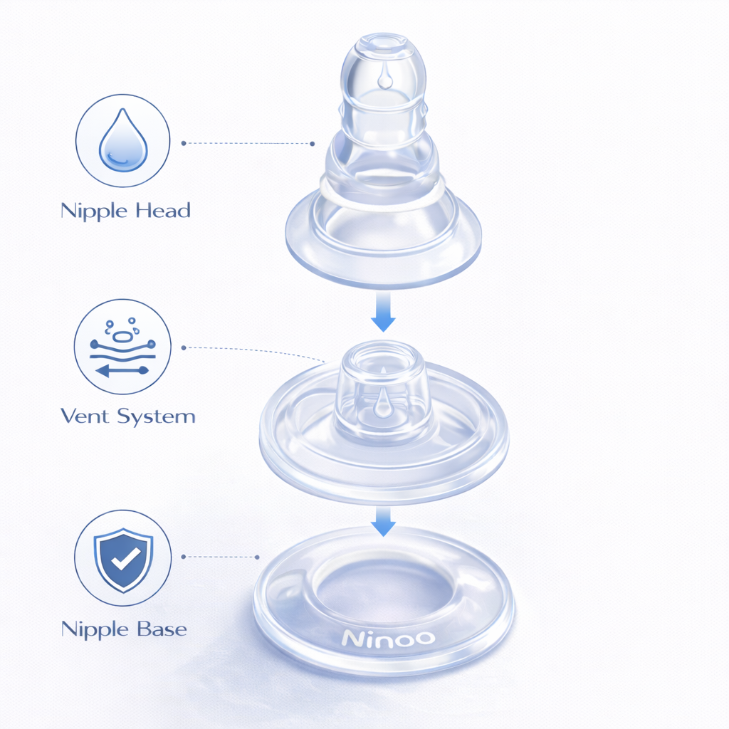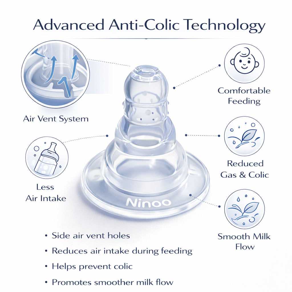 حلمة الرضاعة من Ninoo مصممة لتوفر تجربة رضاعة طبيعية ومريحة للطفل باستخدام سيليكون طبي عالي الجودة مع نظام متطور مضاد للمغص يساعد على تقليل دخول الهواء أثناء الرضاعة وتحسين تدفق الحليب بشكل طبيعي وآمن.