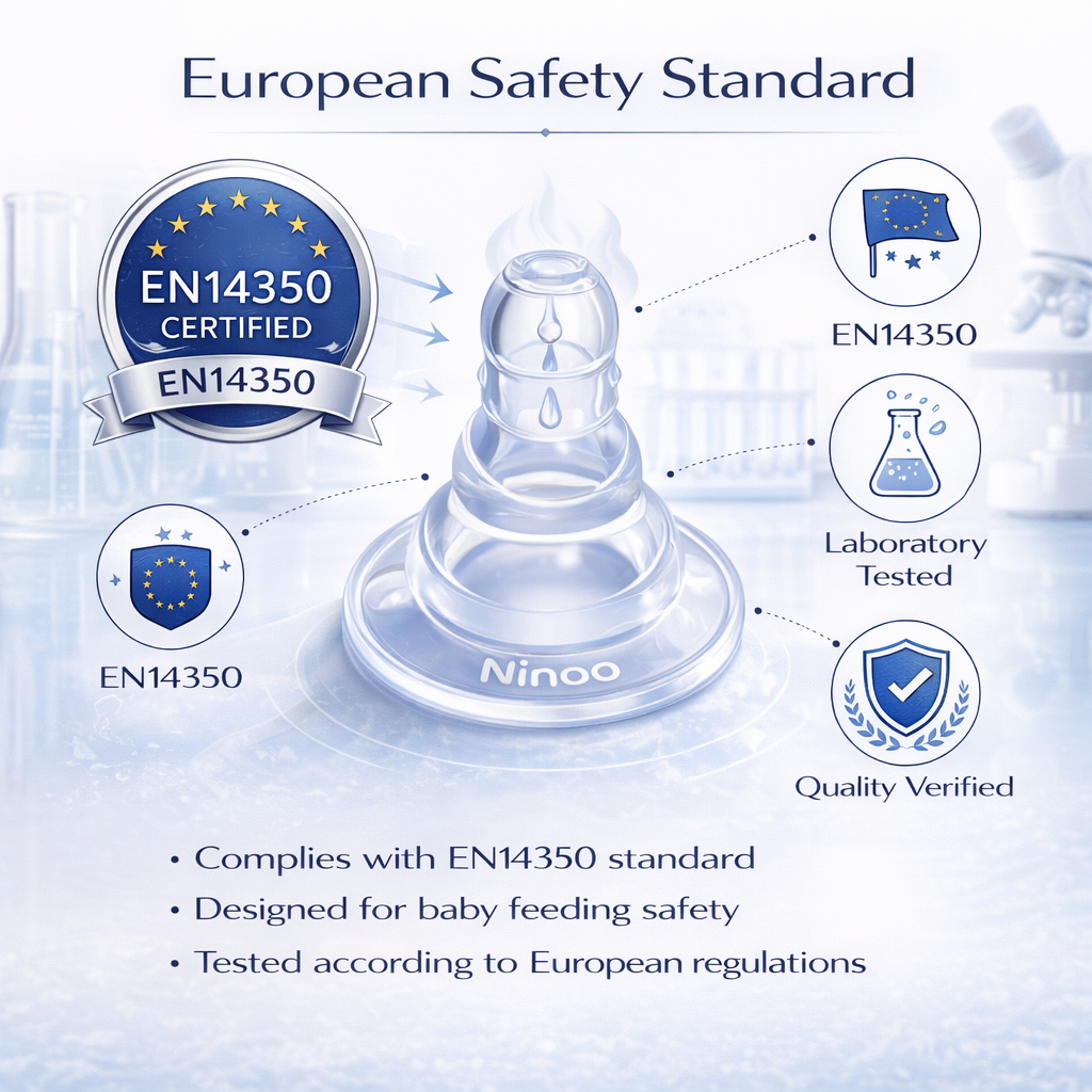 تم تصنيع الحلمة وفق معيار السلامة الأوروبي EN14350 وتم اختبارها مخبرياً لضمان الجودة والسلامة في منتجات تغذية الأطفال.