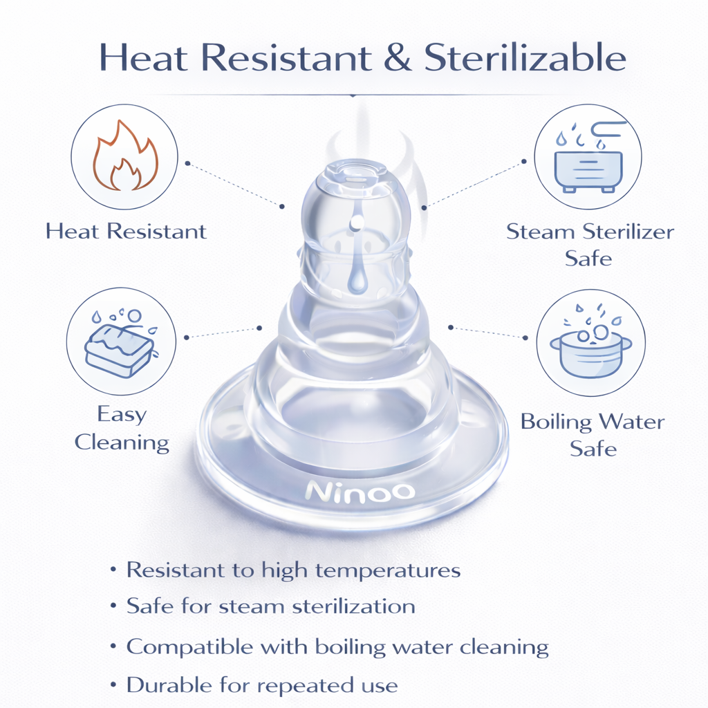 الحلمة مقاومة لدرجات الحرارة العالية ويمكن تعقيمها بالبخار أو تنظيفها بالماء المغلي بسهولة مما يجعلها مناسبة للاستخدام اليومي المتكرر.